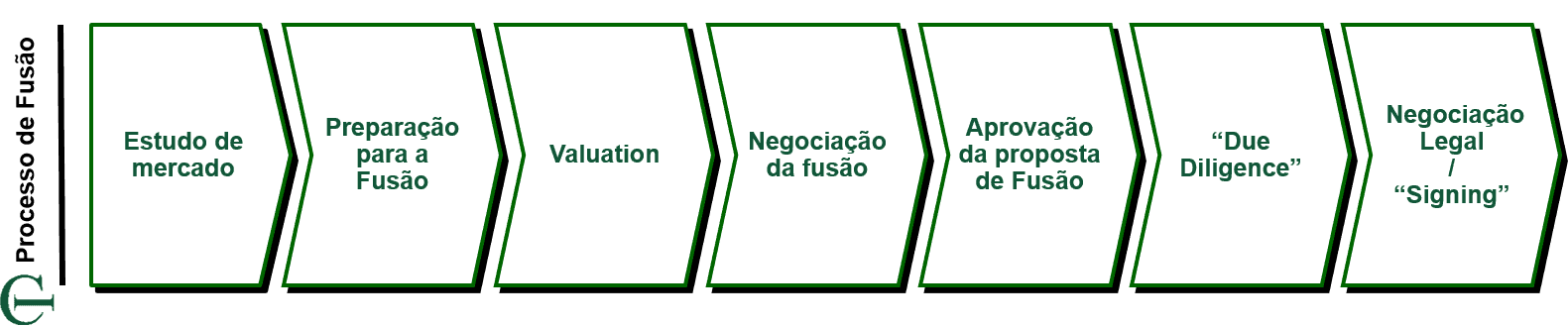 Já o processo para implementar uma fusão normalmente conta com 7 etapas: estudo de mercado, preparação, valuation, negociação, aprovação, “due diligence” e negociação legal.
